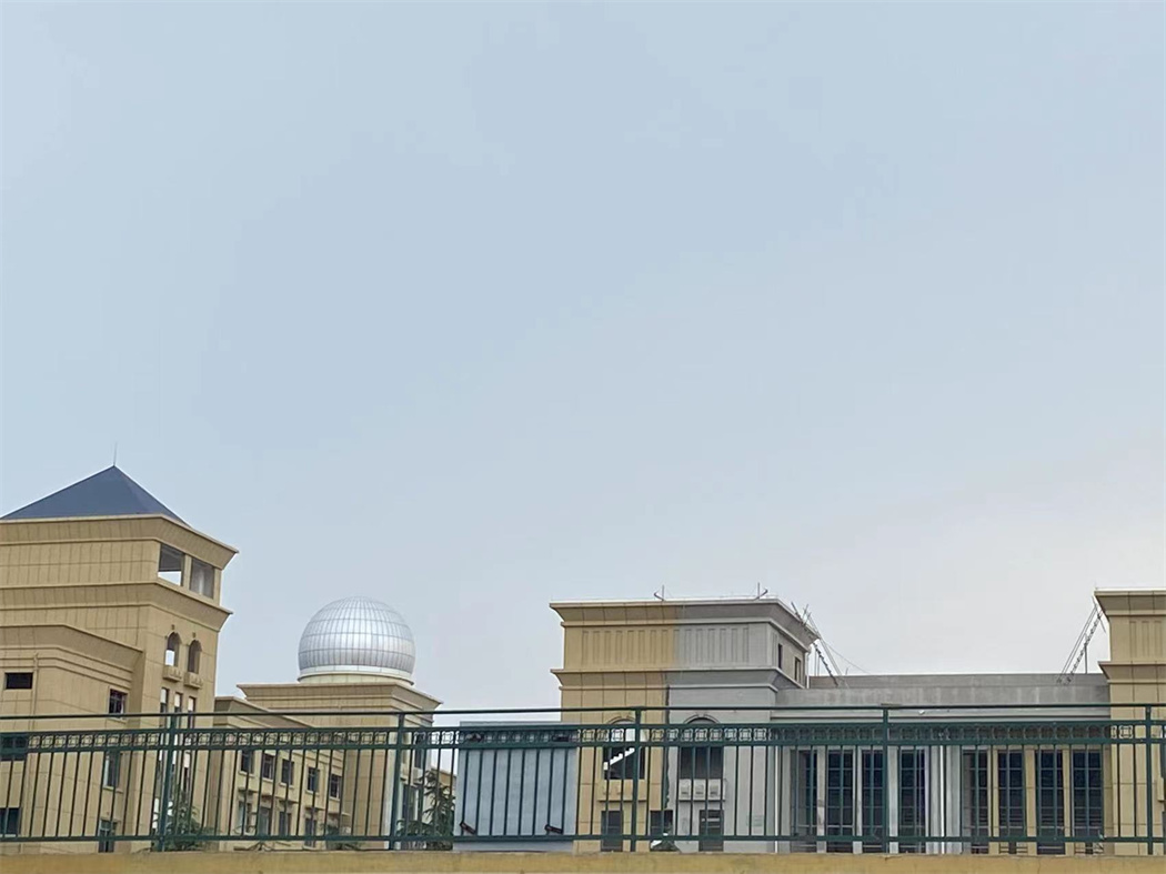淮北中學(xué)天文臺(tái),在樓頂搭建一座2.5米高房子,雙層結(jié)構(gòu),外板采用鋁塑板,內(nèi)板采用微孔鋁板,中間有吸音棉,一樓鋪設(shè)地磚,二樓鋼結(jié)構(gòu),鋼平臺(tái)大梁小梁采用矩形管,定制望遠(yuǎn)鏡基座,用于后期放置望遠(yuǎn)鏡用,制作順墻弧形鋼梯,扶手采用市場(chǎng)專用扶手,美觀、牢固。上層配備9米經(jīng)典式天文圓頂,外殼光滑,具備抗腐蝕,防銹,密封防塵好,不漏雨,也是天文觀測(cè)的標(biāo)志性建筑,經(jīng)典型天文圓頂古典美麗,是大眾認(rèn)知度很高的一種天文建筑。