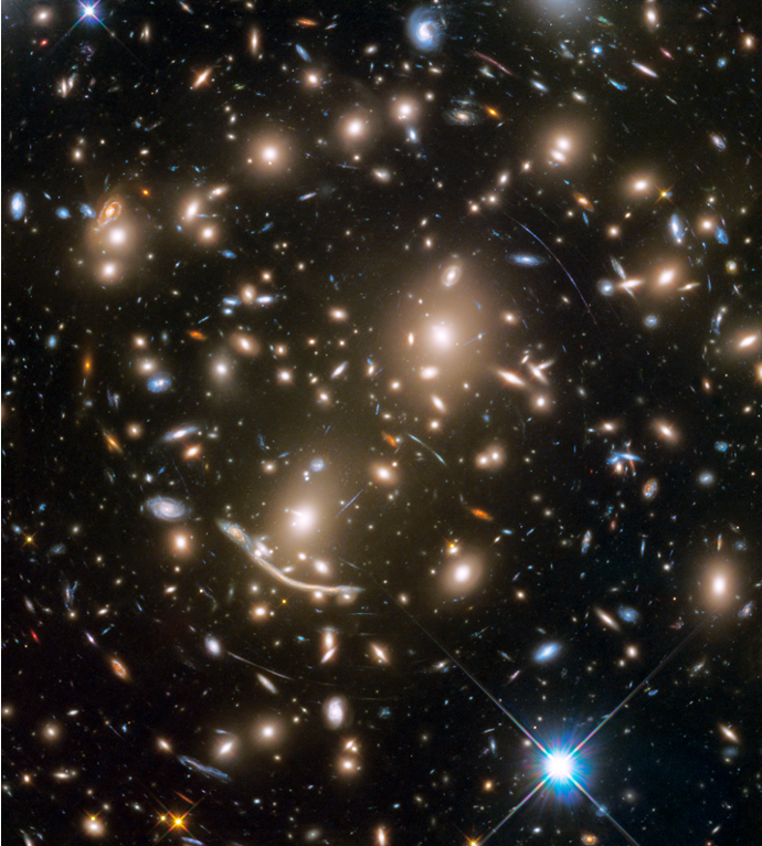 后發(fā)星系團(tuán)里面觀測(cè)到的強(qiáng)引力透鏡效應(yīng)。圖中的弧線都是背景星系發(fā)出的光被后發(fā)星系團(tuán)強(qiáng)大的引力勢(shì)阱彎曲而產(chǎn)生的。(圖源:Hubble Space Telescope in the final Frontier Fields observations)